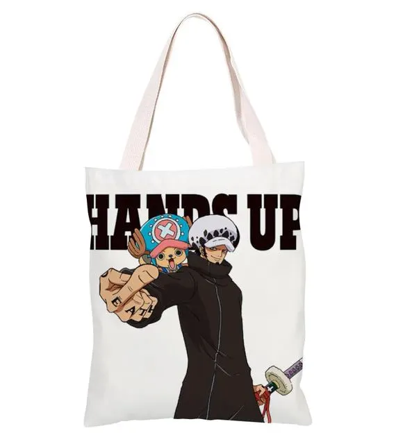 Sac de shopping avec Trafalgar D. Water Law et Tony Tony Chopper devant l’inscription “Hands up” (Mains en l’air).