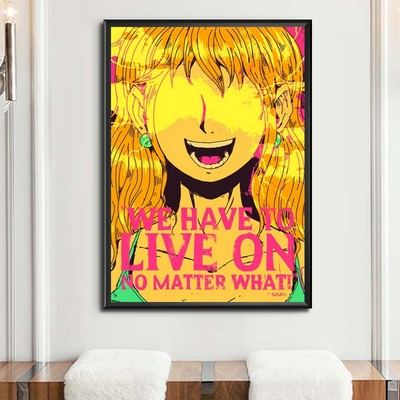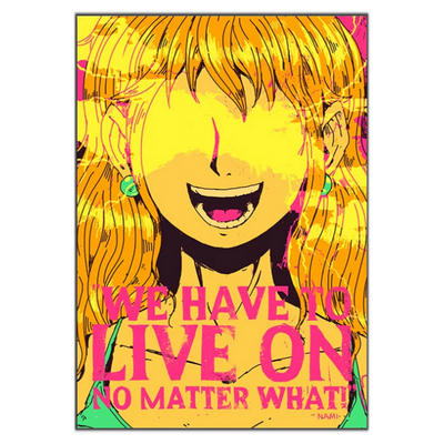 Tableau de Nami avec l’inscription “We have to live on no matter what !” (Nous devons vivre quoi qu’il arrive !)